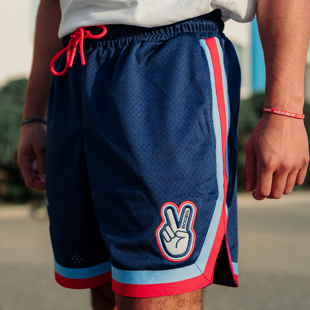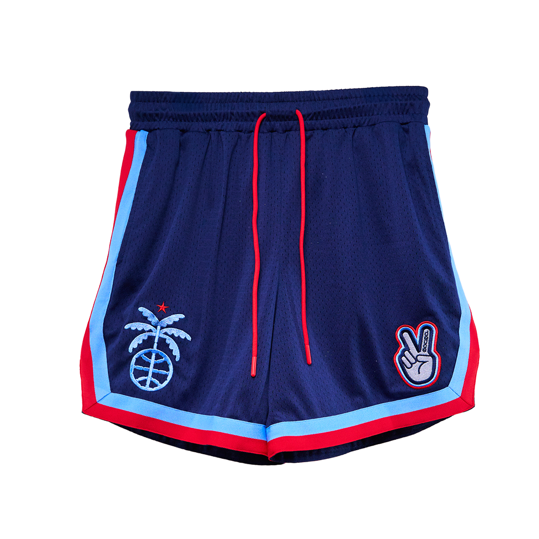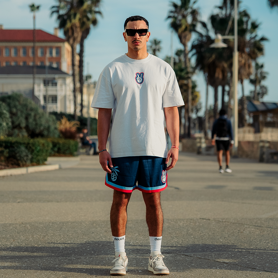 Featuring a deep navy mesh body with bold red and light blue trim, these shorts bring a vintage All-Star aesthetic with modern Deuce execution. The embroidered LA palm tree basketball graphic represents the City of Angels — where hoops meets Hollywood — while the signature Deuce Peace patch adds unmistakable brand identity.