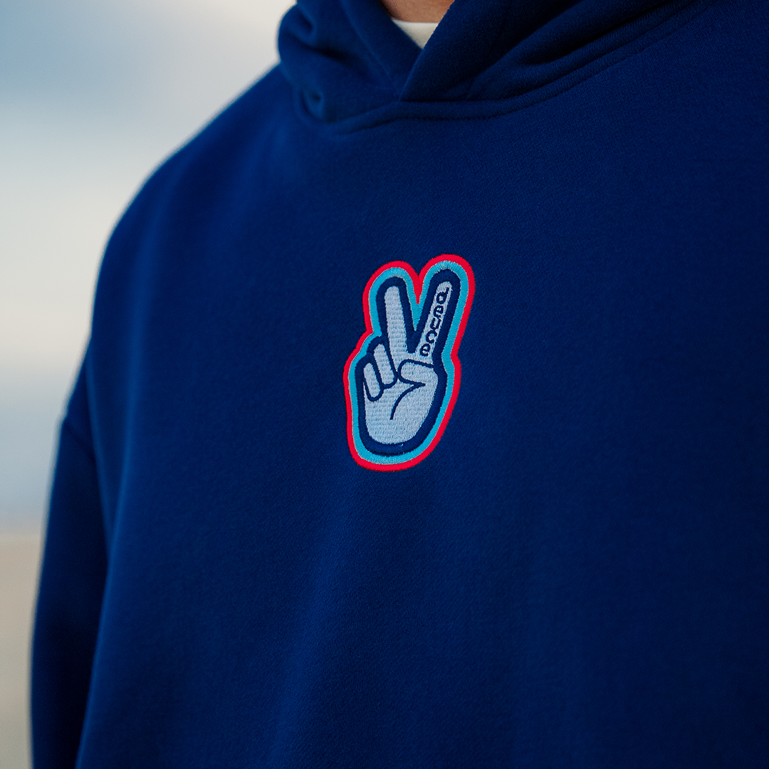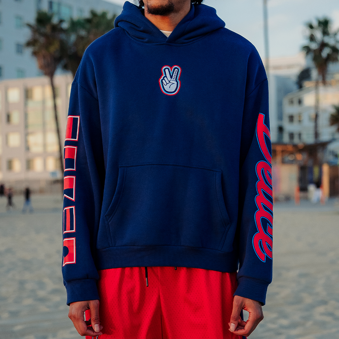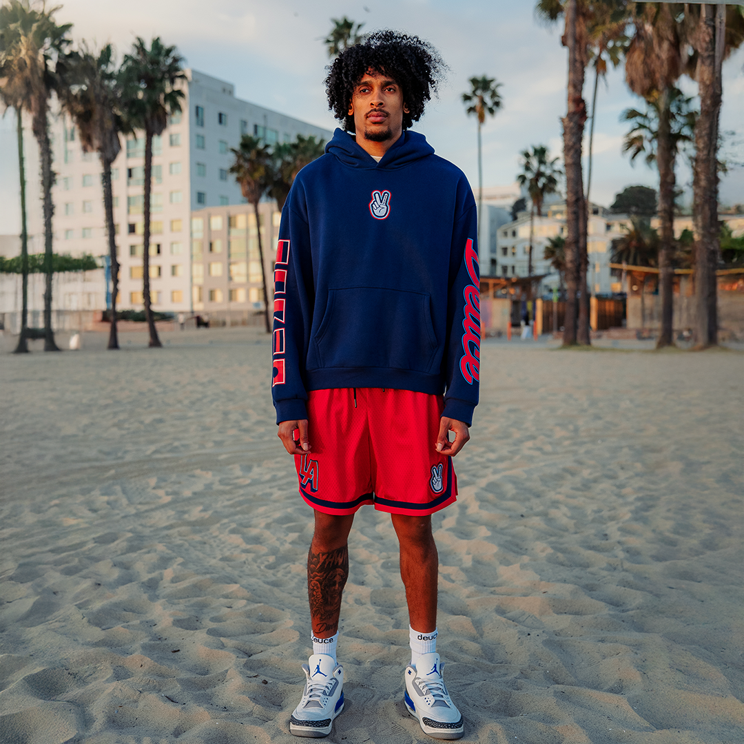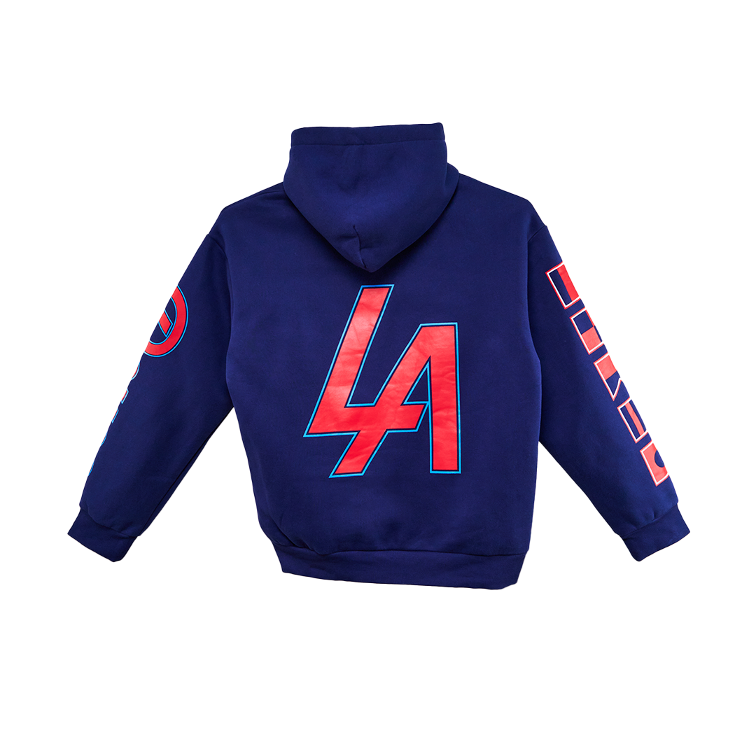 Designed in a deep navy base, this premium hoodie delivers bold ASW identity from every angle. The front features the signature Deuce Peace logo at the chest for a clean, confident look. Turn it around and the oversized LA graphic dominates the back — layered in red with electric blue detailing, inspired by classic West Coast sports heritage.