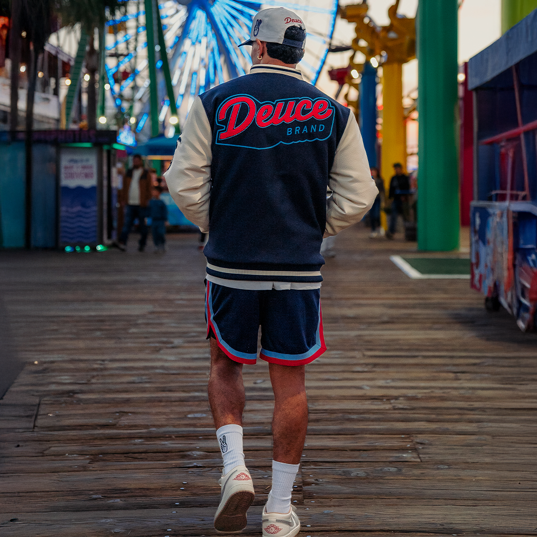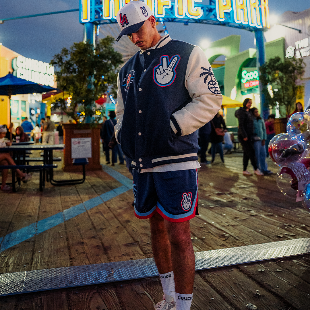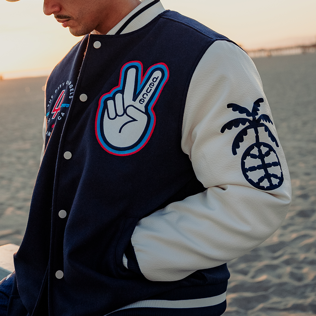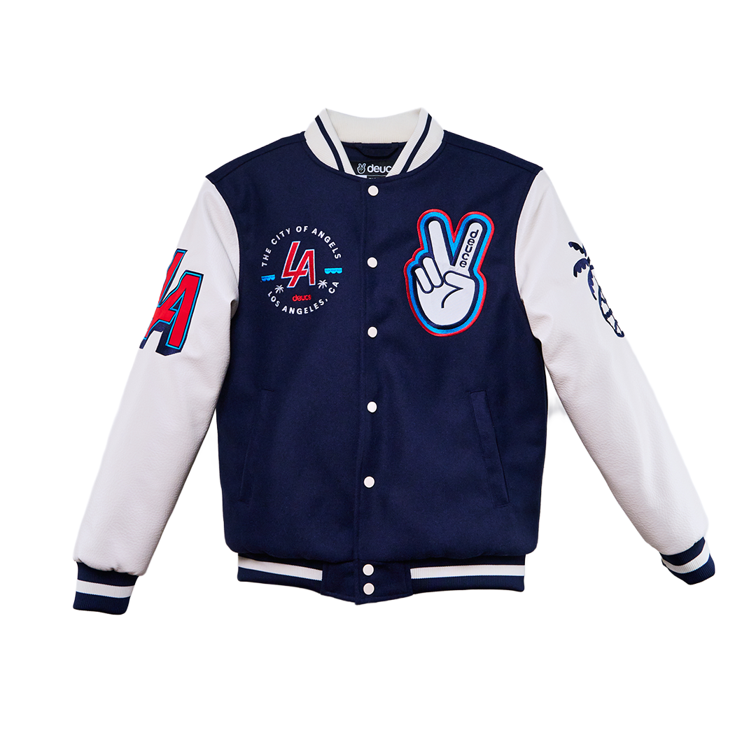 Front and center, the oversized Deuce Peace chenille patch makes a bold statement — layered with red and electric blue detailing to reflect the vibrance of Los Angeles. On the opposite chest, the “LA – City of Angels” embroidery pays tribute to the host city, while the sleeve patch detailing adds that authentic varsity feel.