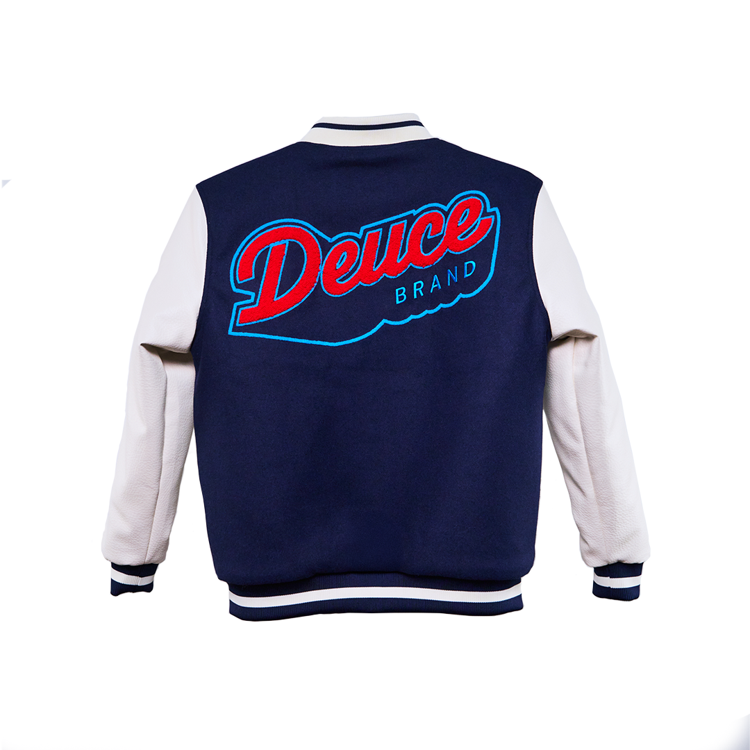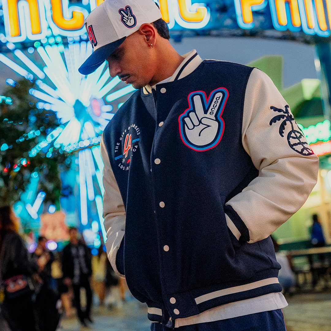 Inspired by classic varsity tradition and elevated with West Coast energy, this piece blends timeless Americana with LA swagger. The deep navy wool-blend body delivers structure and warmth, while the premium off-white PU leather sleeves create that iconic championship contrast.