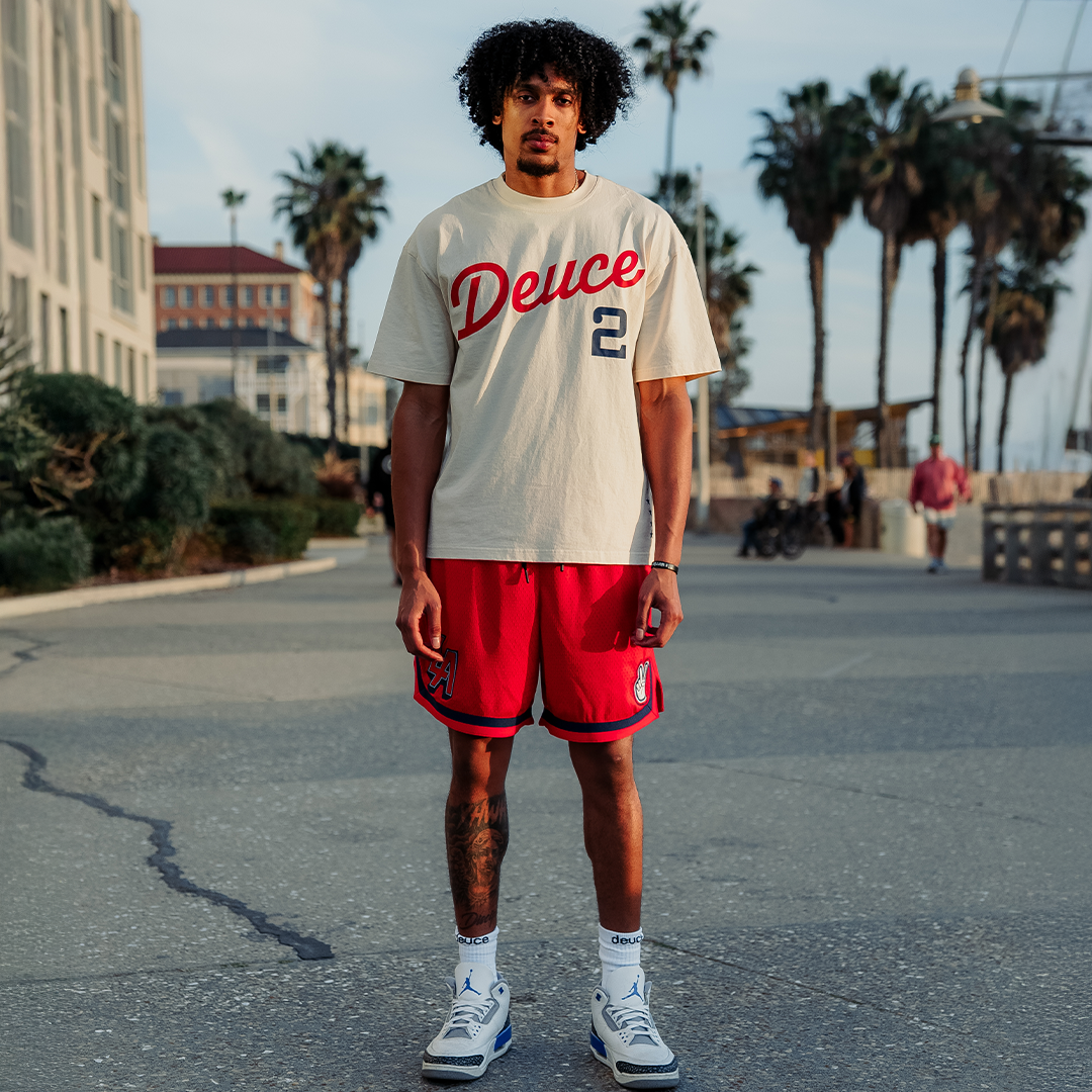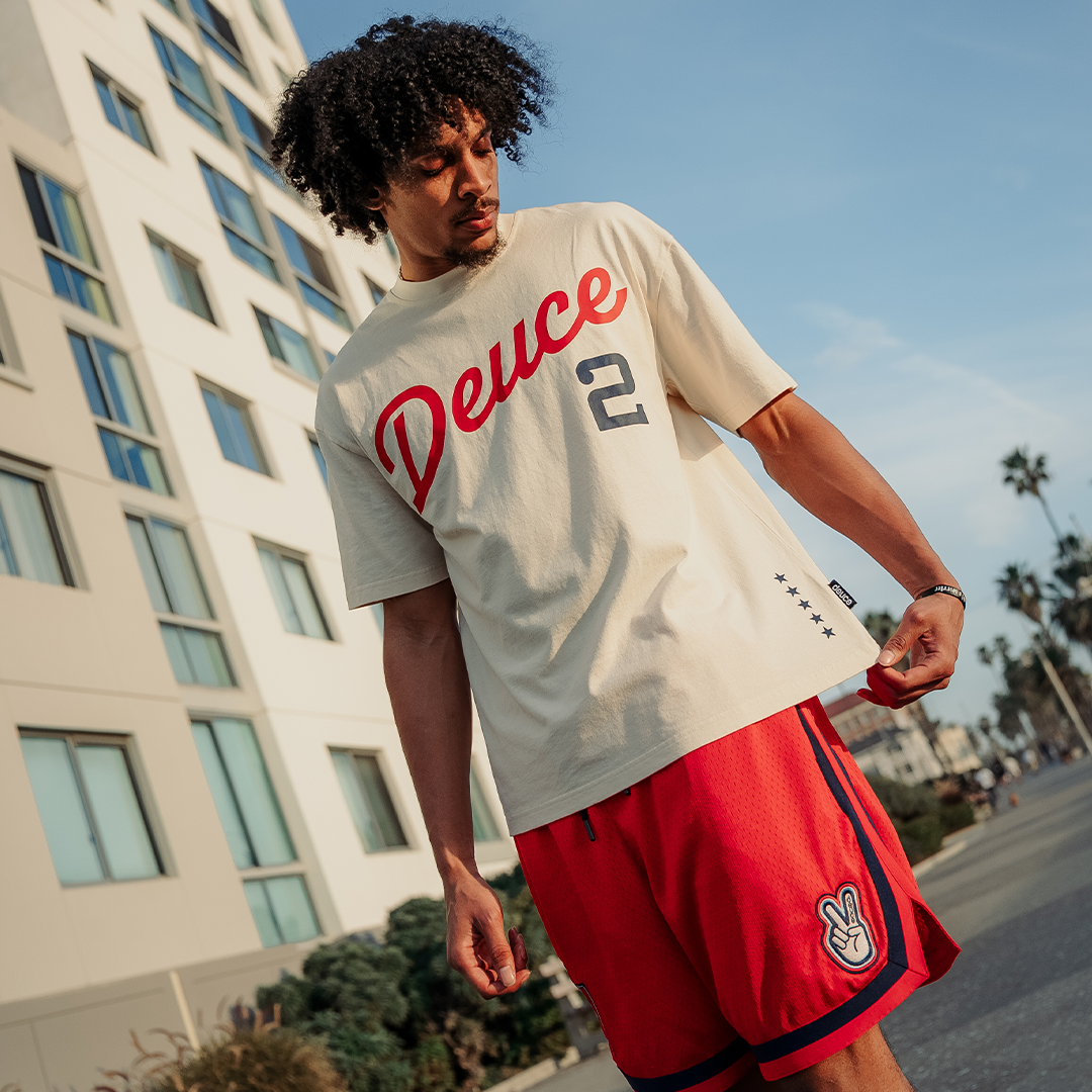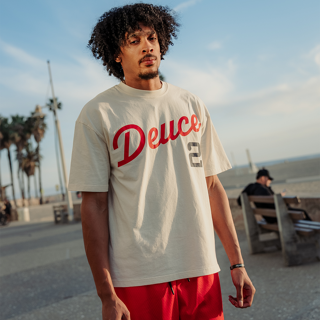 Designed in a premium cream tone, this oversized tee blends classic sports heritage with West Coast identity. The front features bold Deuce script with the signature “2” hit, while the back showcases the oversized LA palm tree basketball graphic — a statement design that represents the City of Angels and the game that lives there. Finished with subtle star detailing and the Deuce Peace logo at the upper back, this tee connects directly to the full ASW LA capsule.