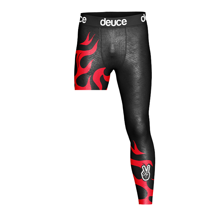 Deuce One Legged Basketball Tights are the on trend hooper tight. The Deuce Peace sign logo is located on the front shin of the left leg and down the back spells deuce. Comfortable, lightweight and made to provide a comfortable compression.